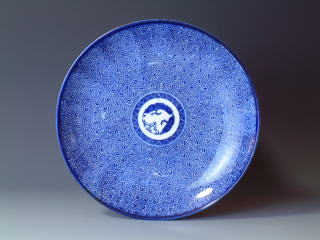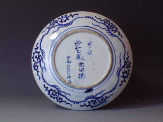 | コバルト使用による型紙摺りの皿 | 裏面は手書きとなっている |
