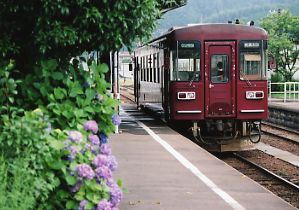 2004年7月3日(土) 長良川鉄道へ 関駅前の無料駐車場に車を置き、土休日有効の1日フリーきっぷ(1500円)を購入し、美濃太田発の1番列車3D(美濃白鳥行)に乗車しました。 開業以来の1形は、庫の横にナガラ2。庫の中に1両。そして、名鉄美濃町線と向かい合っている側線に廃車体が1両見られました。 3Dでやってきたのはナガラ301、ナガラ300形のトップナンバーです。すれちがう車両は300形ばかり・・・ ようやく、白鳥から乗り継いだ503Dで2形のナガラ201が登場しました。 長良川鉄道では、美濃白鳥〜北濃間でスタフ閉塞を行なっており、駅員よりキャリアを受取って出発。 503Dは終点北濃まで、我々親子2人のみでした。 |