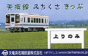 天竜浜名湖鉄道のフリー切符 今回の訪問では、新所原→掛川の片道切符、でも途中駅での途中下車は自由ですよという『みちくさきっぷ』を使いました。 通常この区間の運賃は1280円ですが、この切符は1200円で購入することができます。『上り』用、と『下り』用の2種類があります。 このほか、全線1日乗降り自由のフリー切符(1800円/子供半額)や、65歳以上の人なら1年間有効のフリーパスポート(3650円)などもあります。 詳しくは、同社のHPで! http://www.tenhama.co.jp |