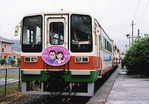 再び車で先回り。朝立寄った浜名湖佐久米駅でお出迎えです。雨も小降りになりヘッドライトを輝かせながらやってきました。 追っ掛けもここまで。軽く昼食を済ませ、折返し駅の三ケ日に行ってみました。 ちょうど挙式が終わったところで、トロッコ列車の前で集合写真の撮影中でした。それにしても雨が上がって良かったですね。 私も記念に一枚撮らせていただきました。 走行中にはTH106にお二人の似顔絵が入ったHマークが取付けられ、停車中には、新所原側にも記念の寿マークが取付けられていました。 |