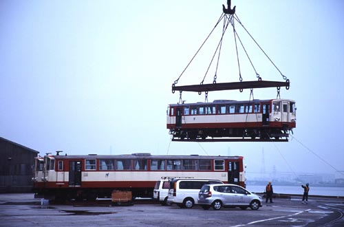 垂れ下がったワイヤーを4人の作業者が操って移動します。