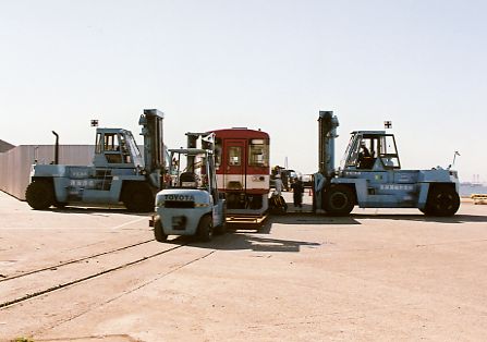 一方、築港線東名古屋港から続く埠頭の線路上では、キハ31の離線作業が続けられていました。フォークリフト2台でLEの車体を持ち上げ、1台が車体の下に鉄枠を押し込んでいきます。鉄枠は台車の下に1枚ずつ、車体中央下に1枚の計3枚が敷かれます。