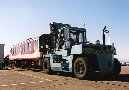 車体の下に敷かれた鉄枠は溶接によって結ばれました。鉄枠の微妙な位置調整はリフトがフォークを鉄枠に突き当ててガンガンやっていました。午前中の作業はキハ32の鉄枠が完成したところで終了。昼休みとなりました。